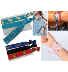 Satin bracelet with plastic round loop for one time use. Adjustable loop. Full color print.