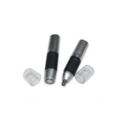 Nose hair remover and trimmer set, including cleaning brush, battery-operated.