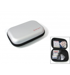 Travel kit in plastic case with: Adhesive Bandage 10 pcs First Aid Mask 1 pc Sterile Gauze Pad 1 pc Cleaning Wipe 1 pc Anti-mosquito Wipe 1 pc Tape 1 pc Scissors 1 pair
