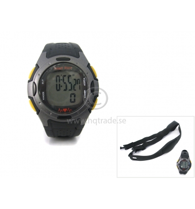 Pulse watch with chest belt. Monitors heart rate with cordless transmission between watch and chest belt.
