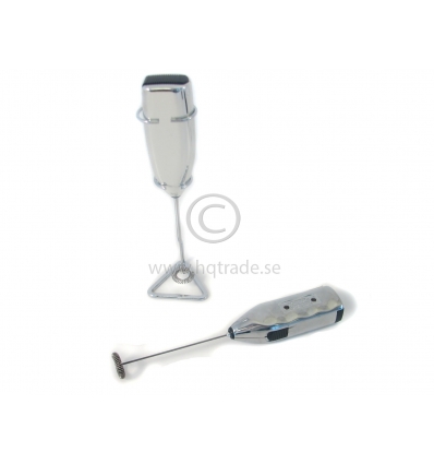 Mini-mjölkskummare av silverfärgat plastmaterial. Med matchande ställ i rostfritt stål. Drivs av 2 x AA batterier.